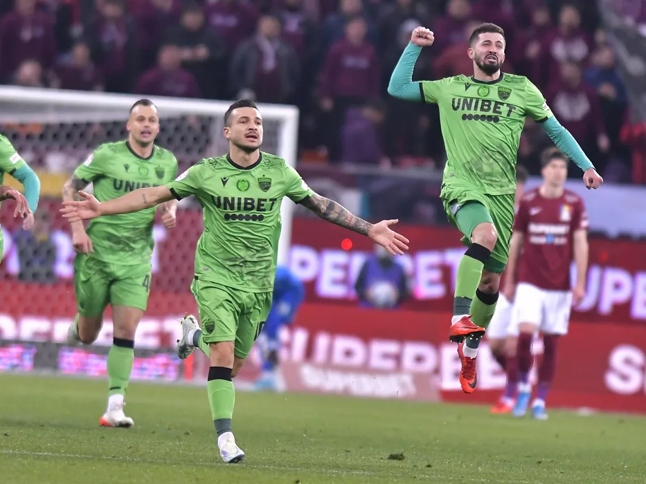 Bucurie a fotbalistilor dinamovisti dupa un gol marcat cu Cosmin Gabriel Matei si Alin Florian Buleica in meciul de fotbal dintre Rapid Bucuresti si Dinamo Bucuresti, contand pentru Liga 1 Casa Pariurilor, desfasurat pe Arena Nationala din Bucuresti, sambata 26 februarie 2022. © FOTO:Razvan Pasarica/SPORT PICTURES
