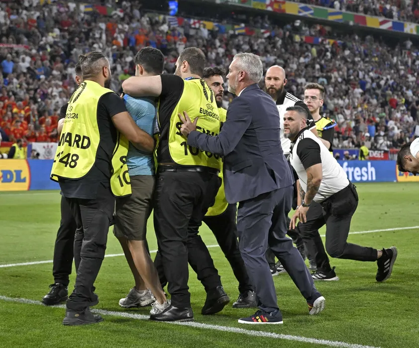 09.07.2024, Fussball UEFA EURO, EM, Europameisterschaft,Fussball 2024, Halbfinale, Spanien - Frankreich, in der Münchner-Fussball-Arena. Ein Flitzer verletzt Alvaro Morata Spanien *** 09 07 2024, Football UEFA EURO 2024, Semi-final, Spain France, at the Munich Football Arena A streaker injures Alvaro Morata Spain,Image: 888615805, License: Rights-managed, Restrictions: Credit images as "Profimedia/ IMAGO", Model Release: no
