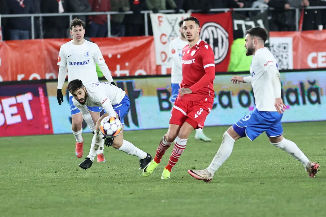 Raul Marian Oprut si Virgil Andrei Ciobanu, Ionut Sebastian Cojocaru, Eduard Gabriel Radaslavescu in meciul de fotbal dintre Dinamo Bucuresti si Farul Constanta, contand pentru SuperLiga Superbet, desfasurat pe Stadionul Arcul de Triumf din Bucuresti,sambata 15 februarie 2025. © FOTO: Gheorghe Fluster/SPORT PICTURES