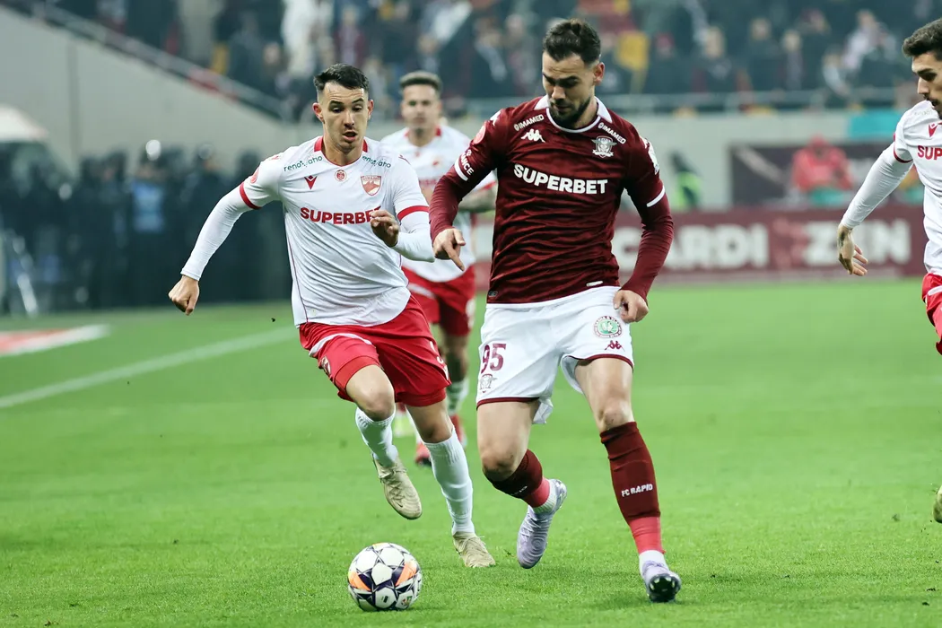 Raul Oprut (S), de la Dinamo, lupta pentru balon cu Elvir Koljic (D), de la Rapid, in timpul meciului de fotbal din a treia etapa a play-off-ului Superligii, disputat pe Arena Nationala din Bucuresti, duminica, 6 aprilie 2025. GEORGE FILIP / MEDIAFAX FOTO