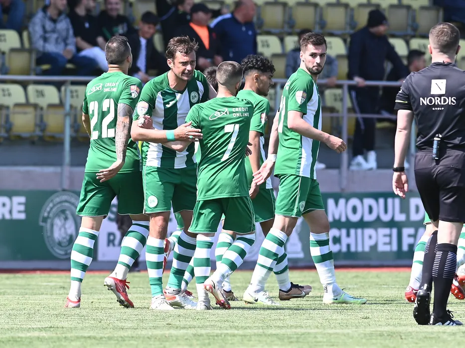 Bucurie a fotbalistilor din Chiajna dupa un gol marcat cu Gabriel Tamas si Dorin Codrea in meciul de fotbal dintre Concordia Chiajna si Progresul Spartac Bucuresti, contand pentru Play-out-ul Ligii a-2-a, desfasurat pe Stadionul comunal Concordia din Chiajna, sambata 22 aprilie 2023. © FOTO:Razvan Pasarica/SPORT PICTURES