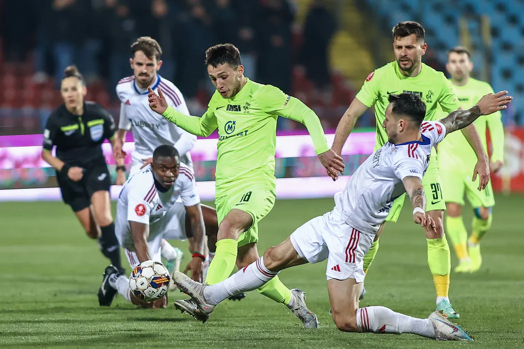 Stefan Stefanovici, Mihai Cătălin Bordeianu și Mihai Andrei Adăscăliței în meciul de fotbal dintre SC Oțelul Galați si Poli Iași, contând pentru Superliga Superbet, desfășurat pe Stadionul Oțelul din Galați, luni 11 martie 2024. © FOTO: Sorin PANĂ/SPORT PICTURES