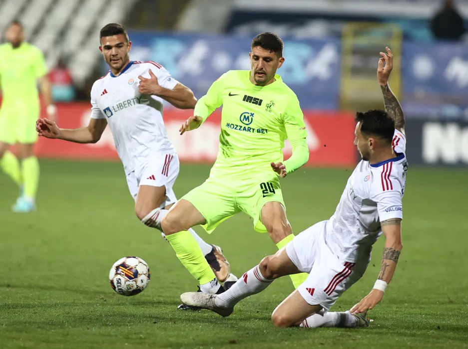Julian Augusto Marchioni Garobbio și Mihai Andrei Adăscăliței, Samuel Teles Pereira Nunes Da Silva în meciul de fotbal dintre SC Oțelul Galați si Poli Iași, contând pentru Superliga Superbet, desfășurat pe Stadionul Oțelul din Galați, luni 11 martie 2024. © FOTO: Sorin PANĂ/SPORT PICTURES