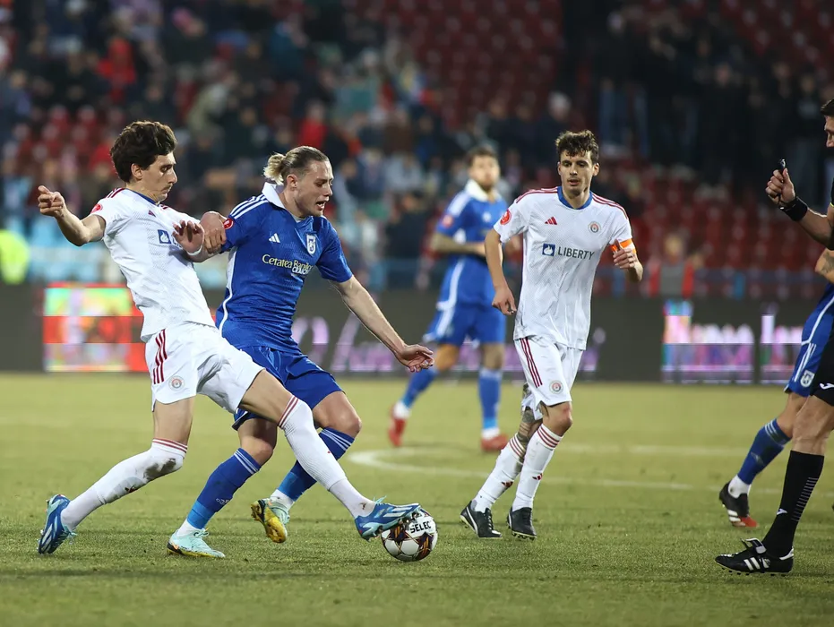 William Guido R Baeten și Mihai Andrei Adăscăliței, Juri Cisotti în meciul de fotbal dintre SC Oțelul Galați si FCU 1948 Craiova, contând pentru Superliga Superbet, desfășurat pe Stadionul Oțelul din Galați, vineri 9 februarie 2024. © FOTO: Sorin PANĂ/SPORT PICTURES