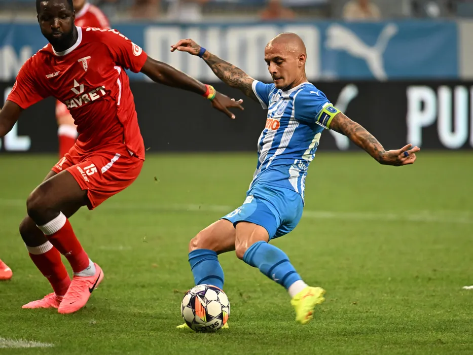 Ionuț Alexandru Mitriță marchează un gol de lângă Ibrahima Sory Conte in meciul dintre Universitatea Craiova si UTA Arad, contand pentru Superliga Superbet, desfasurat pe Stadionul Ion Oblemenco din Craiova, sambata 20 iulie 2024. © FOTO:Razvan Pasarica/SPORT PICTURES