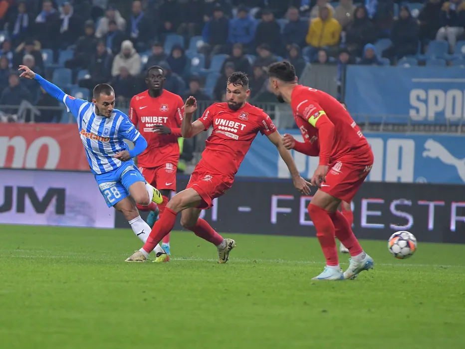 Ionuț Alexandru Mitriță și Valerică Marius Găman în meciul de fotbal dintre Universitatea Craiova și AFC Hermannstadt Sibiu, contând pentru SuperLiga Superbet, desfășurat pe Stadionul Ion Oblemenco din Craiova, sâmbătă 9 noiembrie 2024. © FOTO: Remus BADEA/SPORT PICTURES