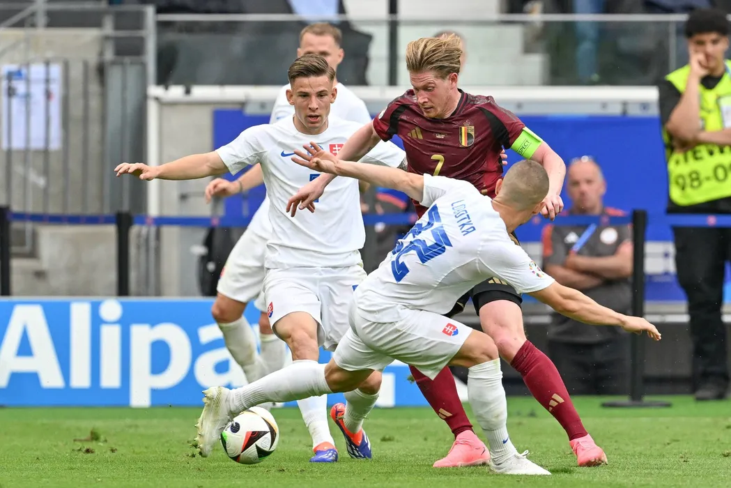 240617 EURO2024 BELGIUM VS SLOVAKIA Tomas Suslov 7 of Slovakia and Stanislav Lobotka 22 of Slovakia fighting for the ball with Kevin De Bruyne 7 of Belgium during a soccer game between the national teams of Belgium, called the Red Devils and Slovakia on the first matchday in Group E in the group stage of the UEFA EURO, EM, Europameisterschaft,Fussball 2024 tournament , on Tuesday 17 June 2024 in Frankfurt , Germany . PHOTO SPORTPIX David Catry FRANKFURT GERMANY Copyright: xx 464244,Image: 882684878, License: Rights-managed, Restrictions: PUBLICATIONxNOTxINxBELxUKxUSA, Credit images as "Profimedia/ IMAGO", Model Release: no