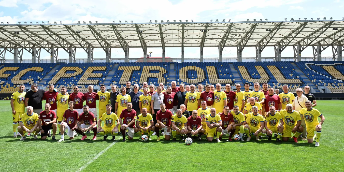 Fotbaliștii celor doua echipe la o fotografie de grup realizată înaintea meciului amical de fotbal old boys dintre Petrolul Ploiesti si Rapid Bucuresti, reeditarea finalei Cupei Romaniei, editia 1995, desfasurat pe stadionul Ilie Oana din Ploiesti, sambata 21 iunie 2025. © FOTO:Razvan Pasarica/SPORT PICTURES