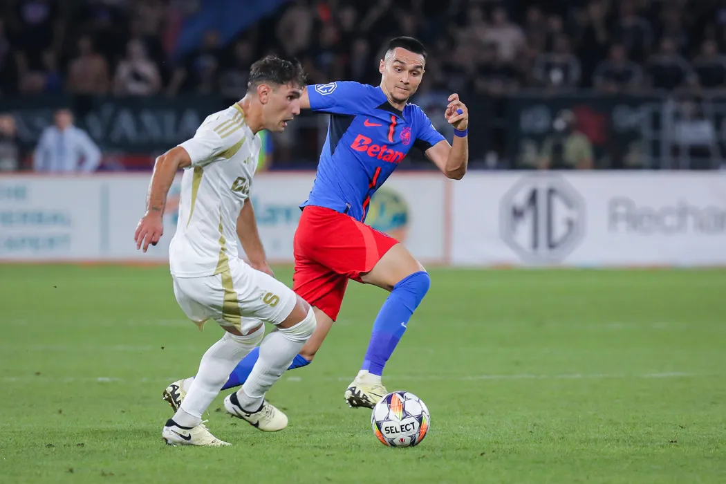 Qazim Laçi și Adrian Gheorghe Șut în meciul de fotbal dintre FCSB și Sparta Praga, contând pentru preliminariile UEFA Champions League, desfășurat pe Stadionul Steaua din București, marți 13 august 2024. © FOTO: Mihai-Antonio VASILE/SPORT PICTURES