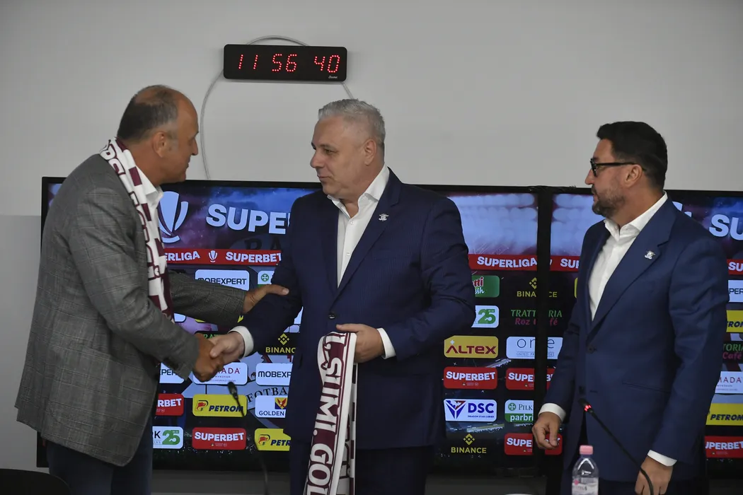 Dan Șucu, Marius Șumudică și Viorel Moldovan participă la o conferință de presă desfășurată la Clubul Rapid din București, miercuri 21 august 2024. © FOTO: Simion MECHNO/SPORT PICTURES