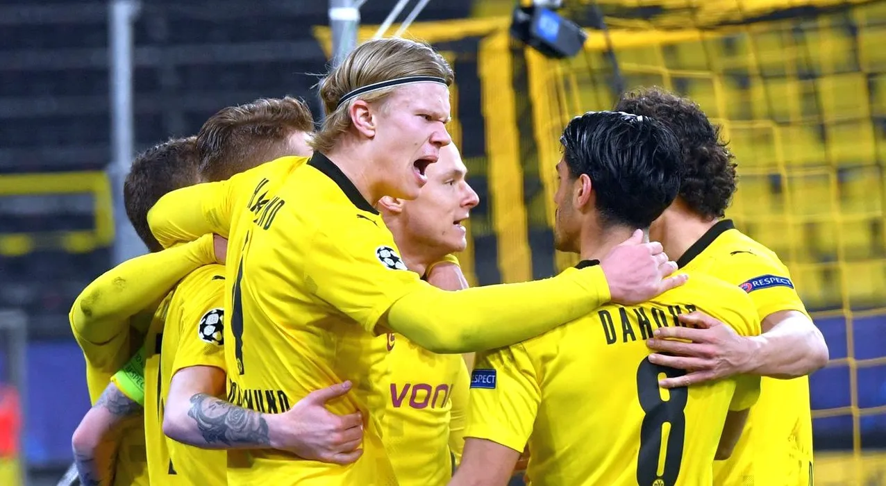 09 March 2021, North Rhine-Westphalia, Dortmund: Football: Champions League, Borussia Dortmund - FC Sevilla, knockout round, round of 16, second leg at Signal Iduna Park. Dortmund's Erling Haaland celebrates with teammates after scoring the goal to make it 1:0. IMPORTANT NOTE: In accordance with the regulations of the DFL Deutsche Fußball Liga and the DFB Deutscher Fußball-Bund, it is prohibited to use or have used photographs taken in the stadium and/or of the match in the form of sequence pictures and/or video-like photo series. Photo: Bernd Thissen/dpa-Pool/dpa,Image: 596324690, License: Rights-managed, Restrictions: GERMANY OUT, Model Release: no