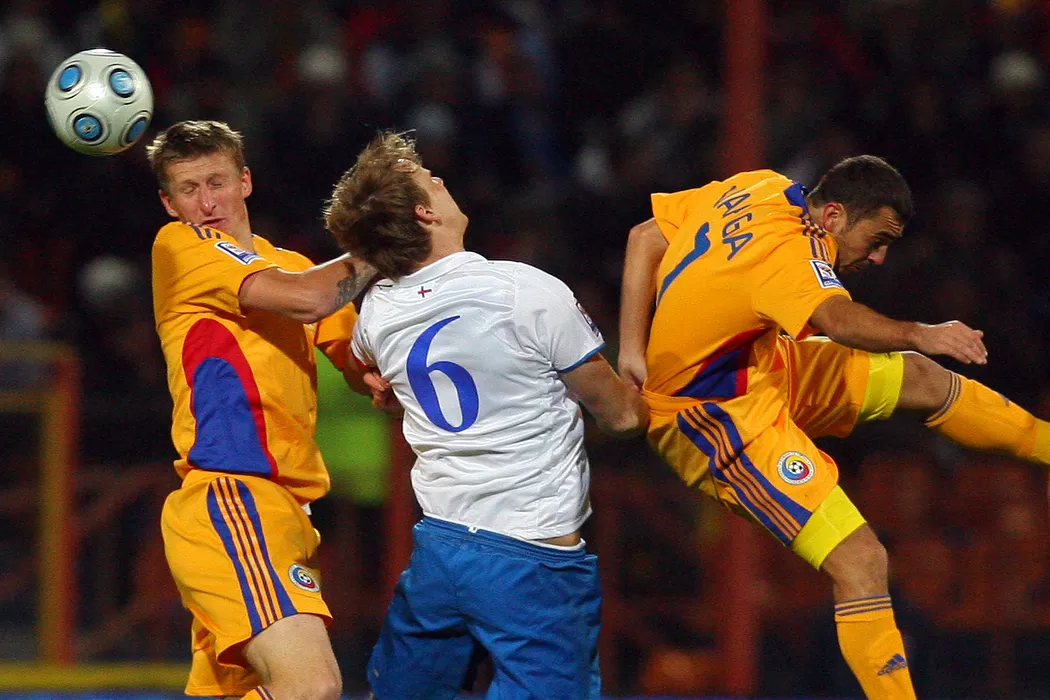Dorin Goian (S), de la nationala Romaniei, se lupta cu Rogvi Jacobsen (C), de la nationala de fotbal a Insulelor Feroe, din cadrul preliminariilor Cupei Mondiale 2010, in Piatra Neamt, miercuri, 14 octombrie 2009. MIRCEA ROSCA / MEDIAFAX FOTO