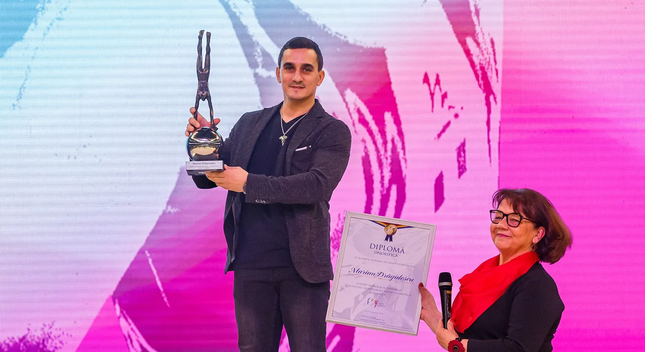 Festivitatea de retragere din activitate a gimnastului Marian Dragulescu, multiplului campion mondial si european, desfasurata la Cluj-Napoca, sambata, 10 decembrie 2022. In imagine, Marian Dragulescu si Carmencita Constantin, presedinta Federatiei Romane de Gimnastica. DAN HORIA TAUTAN / MEDIAFAX FOTO
