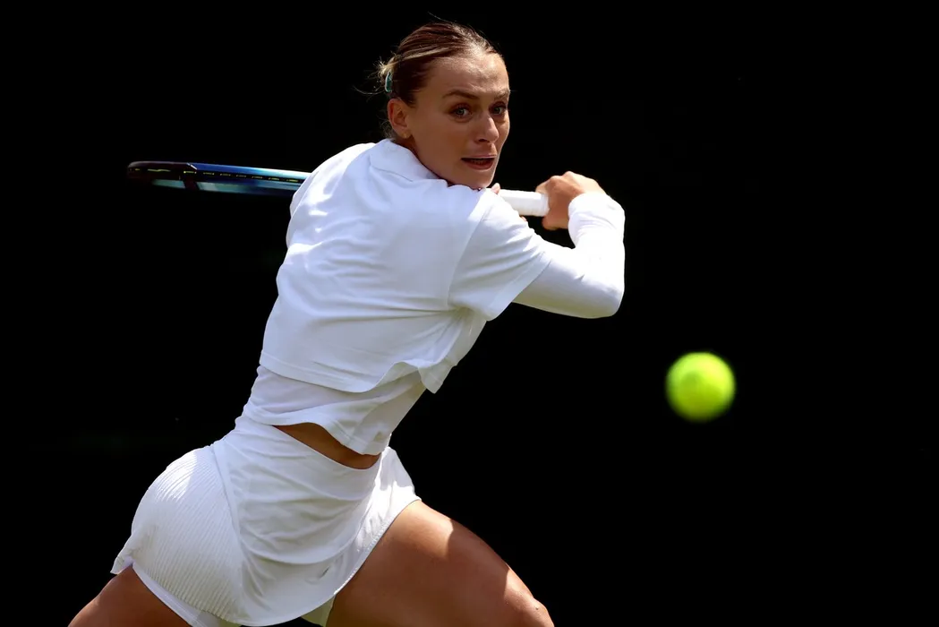 Ana Bogdan during her match against Liudmila Samsonova (not pictured) on day one of the 2023 Wimbledon Championships at the All England Lawn Tennis and Croquet Club in Wimbledon. Picture date: Monday July 3, 2023.,Image: 786917678, License: Rights-managed, Restrictions: Editorial use only. No commercial use without prior written consent of the AELTC. Still image use only - no moving images to emulate broadcast. No superimposing or removal of sponsor/ad logos., Model Release: no