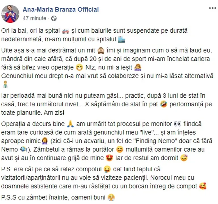 Ana-Maria Brânză, fotografie de pe patul de spital, după operație! „Genunchiul meu drept n-a mai vrut să colaboreze”. Cum a primit spadasina compot de acasă
