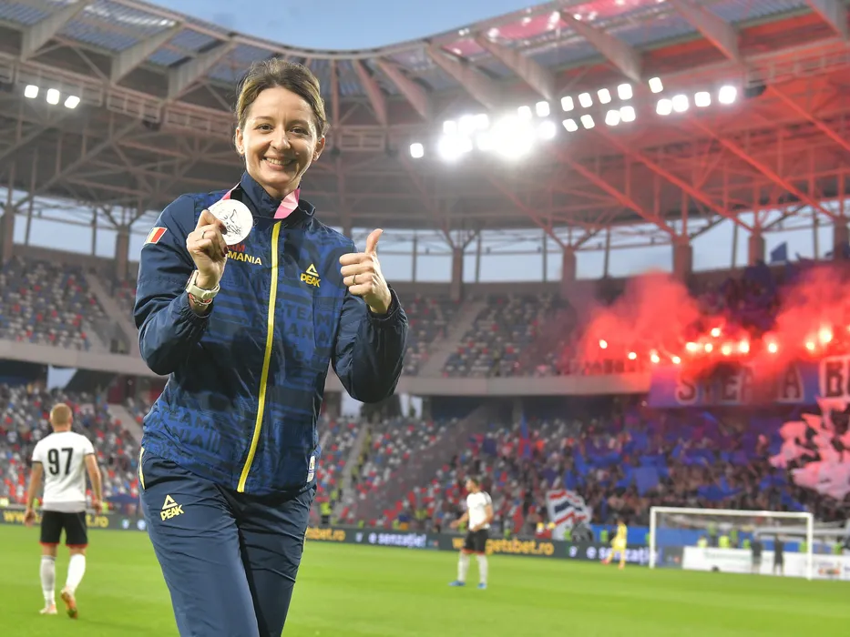 Ana Maria Branza, proaspat medaliata la olimpiada de la Tokio, se pregateste sa dea lovitura de incepere la meciul de fotbal dintre Steaua Bucuresti si FK Csikszereda Miercurea Ciuc, contand pentru Liga a-2-a Casa Pariurilor, desfasurat pe Stadionul Steaua-Ghencea din Bucuresti, miercuri 4 august 2021. © FOTO:Razvan Pasarica/SPORT PICTURES