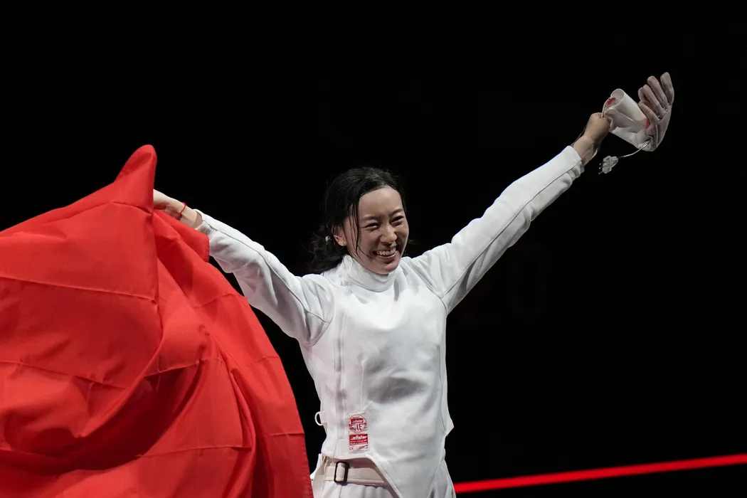 Sun Yiwen of China celebrates winning the gold medal after defeating Ana Maria Popescu of Romenia in the women's individual Epee final competition at the 2020 Summer Olympics, Saturday, July 24, 2021, in Chiba, Japan. (AP Photo/Hassan Ammar)