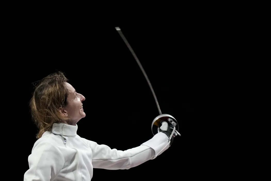 Ana Maria Popescu of Romenia celebrates after defeating Katrina Lehis of Estonia in a women's individual Epee semifinal competition at the 2020 Summer Olympics, Saturday, July 24, 2021, in Chiba, Japan. (AP Photo/Andrew Medichini)