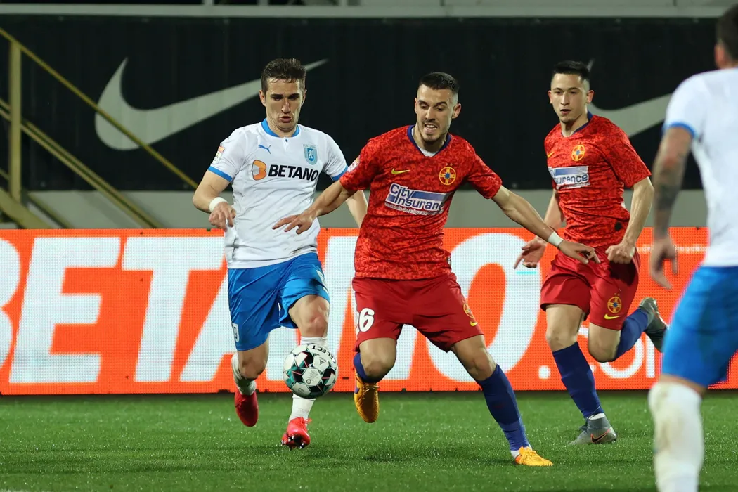 Razvan Oaida (D), de la FCSB, lupta pentru balon cu Bogdan Vatajelu (S), de la Universitatea Craiova, in meciul de fotbal din etapa 29 a Ligii 1, disputat pe stadionul Marin Anastasovici din Giurgiu, duminica, 4 aprilie 2021. GEORGE FILIP / MEDIAFAX FOTO