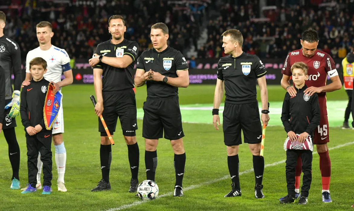 Brigada de arbitrii formata din Vasile Marinescu, Istvan Kovacs si Daniel Mitruti alaturi de capitanii Florin Lucian Tanase si Mario Camora in meciul de fotbal dintre CFR Cluj si FCSB, contand pentru Play-off-ul Ligii 1 Casa Pariurilor, desfasurat pe Stadionul CFR Dr. Constantin Radulescu din Cluj Napoca, duminica 17 aprilie 2022. © FOTO:Razvan Pasarica/SPORT PICTURES
