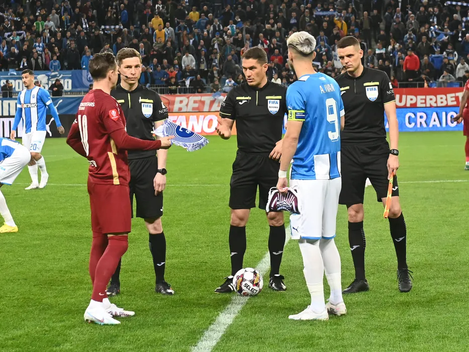 Brigada de arbitrii formata din George Florin Neacsu, Istvan Kovacs si Ferencz Tunyogi alaturi de capitanii Ciprian Ioan Deac si Andrei Virgil Ivan in meciul de fotbal dintre Universitatea Craiova si CFR Cluj, contand pentru Play-off-ul Superligii Superbet, desfasurat pe Stadionul Ion Oblemenco din Craiova, duminica 2 aprilie 2023. © FOTO:Razvan Pasarica/SPORT PICTURES