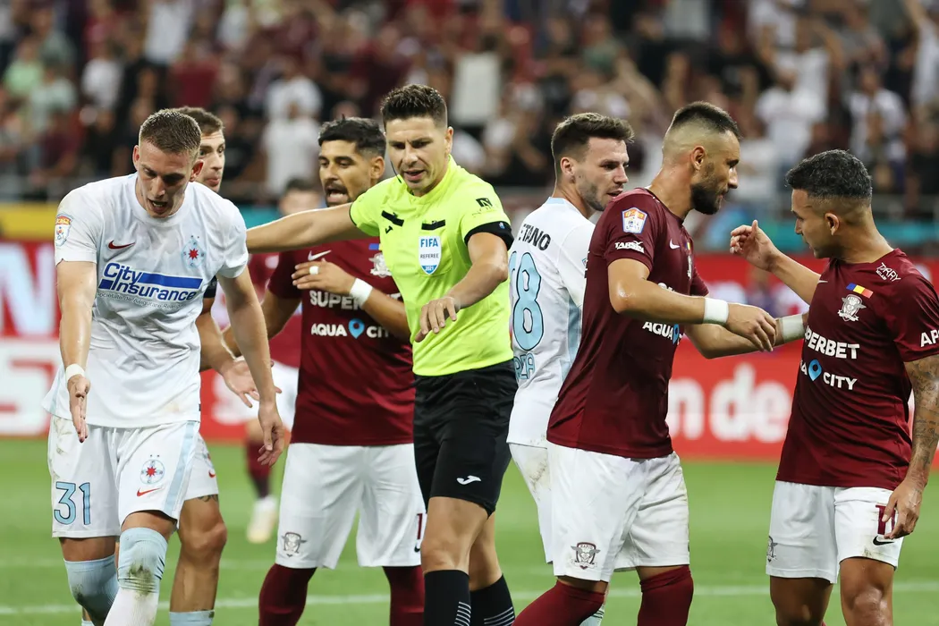Arbitrul Marian Barbu (C) conduce meciul de fotbal dintre echipele Rapid si FCSB din etapa a V-a a Ligii 1, disputat pe stadionul Giulesti - Valentin Stanescu din Bucuresti, sambata, 15 august 2021. GEORGE FILIP / MEDIAFAX FOTO