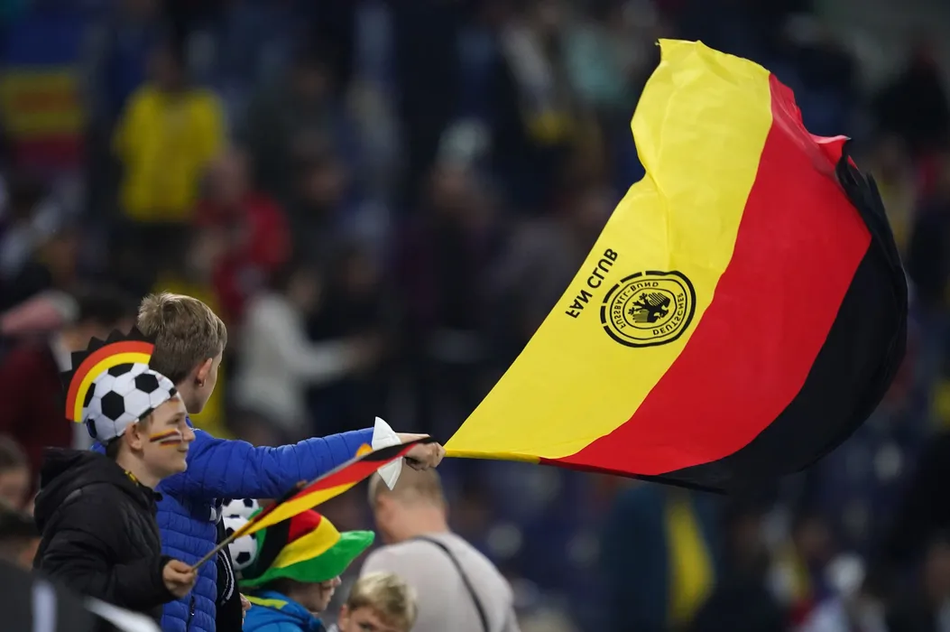 Fans cheer in the stands during and interview in meciul de fotbal dintre Germania si Romania, contand pentru preliminariile Campionatului Mondial din 2022, desfasurat pe Stadionul Vorksparkstadion din Hamburg, vineri 8 octombrie 2021. © FOTO:SPORT PICTURES