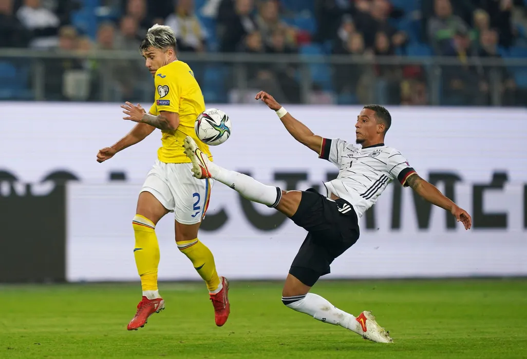 Germany's Thilo Kehrer (R) and Romania's Andrei Ratiu fight for the ball in meciul de fotbal dintre Germania si Romania, contand pentru preliminariile Campionatului Mondial din 2022, desfasurat pe Stadionul Vorksparkstadion din Hamburg, vineri 8 octombrie 2021. © FOTO:SPORT PICTURES