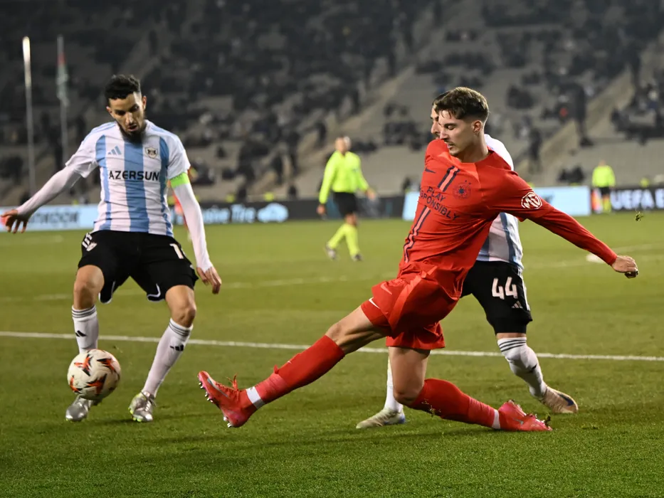 Abdellah Zoubir si David Raul Miculescu in meciul de fotbal dintre Qarabag si FCSB, din cadrul UEFA Europa League, desfasurat pe Stadionul Republican Tofiq Bahramov din Baku, joi 23 ianuarie 2025. © FOTO:Razvan Pasarica/SPORT PICTURES