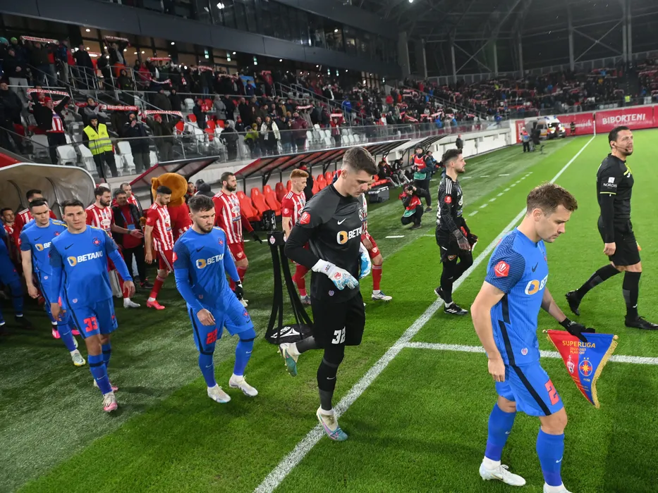 Fotbalistii stelisti Risto Radunovic, Deian Cristian Sorescu, Stefan Tarnovanu si Darius Dumitru Olaru la startul meciului de fotbal dintre Sepsi OSK Sfantu Gheorghe si FCSB, contand pentru Play-off-ul Superligii Superbet, desfasurat pe Sepsi Arena din Sfantu Gheorghe, luni 3 aprilie 2023. © FOTO:Razvan Pasarica/SPORT PICTURES