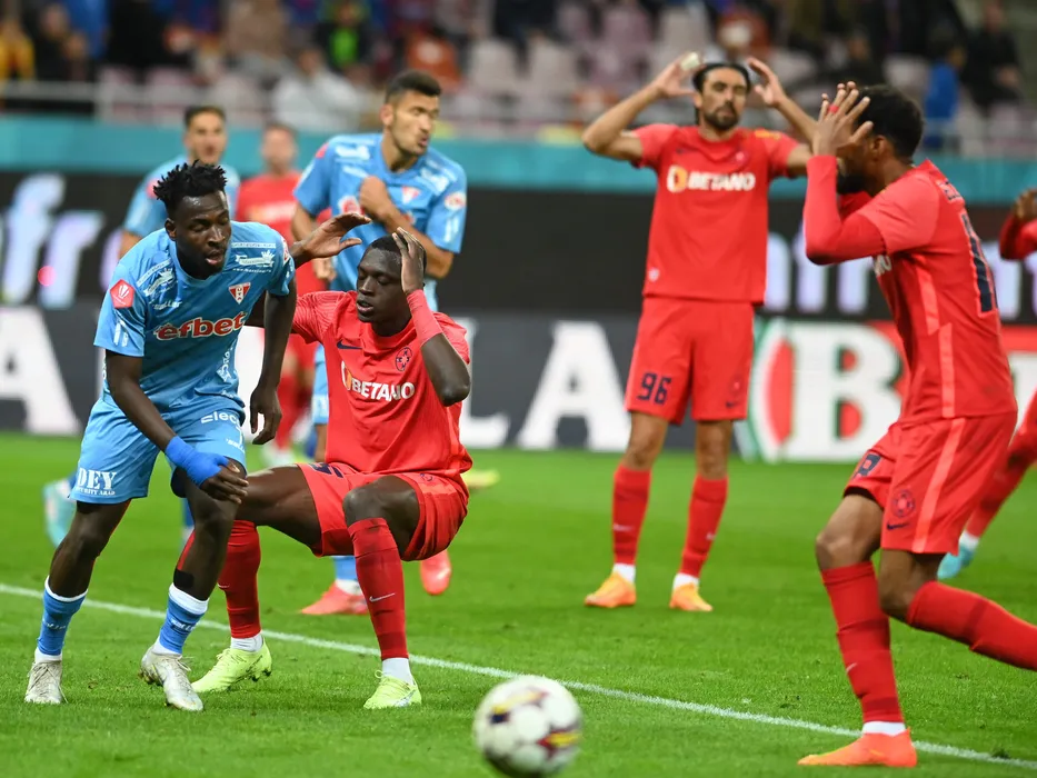 Fotbalistii stelisti Joyskim Aurelien Dawa Tchakonte si Sylas Laouari Edjouma Malcom isi pun mainile pe cap dupa o ratare avuta la meciul de fotbal dintre FCSB si UTA Arad, contand pentru Superliga Superbet, desfasurat pe Arena Nationala din Bucuresti, duminica 16 octombrie 2022. © FOTO:Razvan Pasarica/SPORT PICTURES