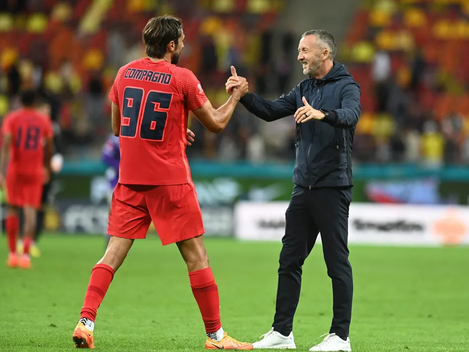 Mihai Stoica il felicita pe Andrea Compagno dupa meciul de fotbal dintre FCSB si FC Arges, contand pentru Superliga Superbet, desfasurat pe Arena Nationala din Bucuresti, duminica 2 octombrie 2022. © FOTO:Razvan Pasarica/SPORT PICTURES