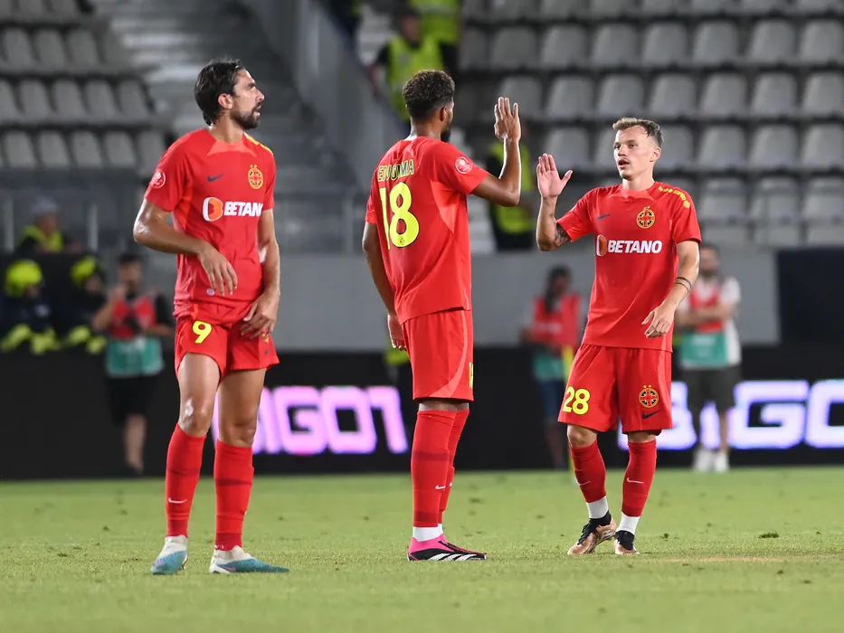 Fotbalistii stelisti Andrea Compagno, Sylas Laouari Edjouma Malcom si Grigoras Alexandru Pantea se felicita dupa meciul de fotbal dintre FCSB si Dinamo Bucuresti, din cadrul Superligii Superbet, desfasurat pe Stadionul National Arcul de Triumf din Bucuresti, sambata 22 iulie 2023. © FOTO:Razvan Pasarica/SPORT PICTURES