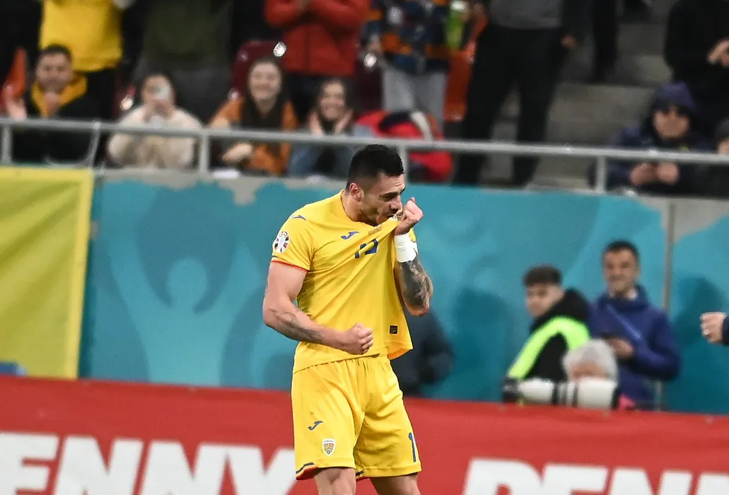 Andrei Burca se bucura dupa un gol marcat sarutand tricoul echipei nationale in meciul de fotbal dintre Romania si Belarus, din cadrul preliminariilor Campionatului European 2024, desfasurat pe Arena Nationala, marti 28 martie 2023. © FOTO:Razvan Pasarica/SPORT PICTURES