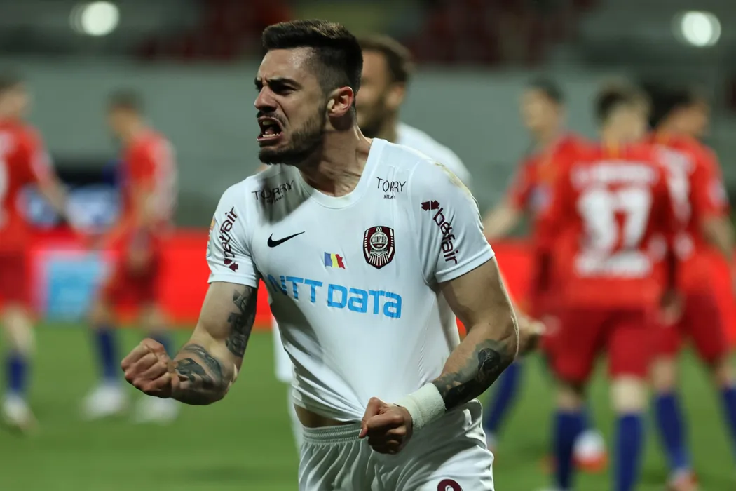 Andrei Burca se bucura dupa un gol reusit in meciul de fotbal dintre FCSB si CFR Cluj, contand pentru Play-off-ul Ligii 1 Casa Pariurilor, desfasurat fara spectatori pe Stadionul Marin Anastasovici din Giurgiu, luni 3 mai 2021. © FOTO:Gheorghe Fluster/SPORT PICTURES