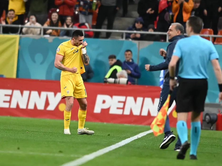 Andrei Burca se bucura dupa un gol marcat sarutand tricoul echipei nationale in meciul de fotbal dintre Romania si Belarus, din cadrul preliminariilor Campionatului European 2024, desfasurat pe Arena Nationala, marti 28 martie 2023. © FOTO:Razvan Pasarica/SPORT PICTURES