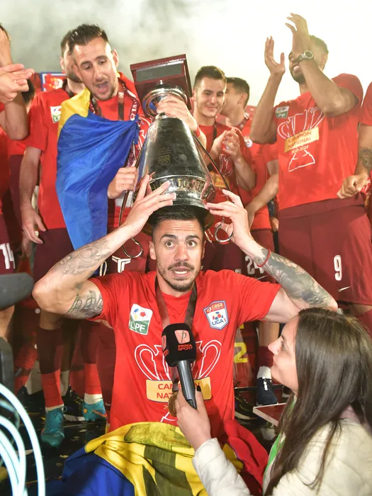 Andonie Andrei Burca se bucura cu trofeul pe cap dupa castigarea campionatului in urma meciului de fotbal dintre CFR Cluj si Universitatea Craiova, contand pentru Play-off-ul Ligii 1 Casa Pariurilor, desfasurat pe Stadionul CFR Dr. Constantin Radulescu din Cluj Napoca, duminica 15 mai 2022. © FOTO:Razvan Pasarica/SPORT PICTURES