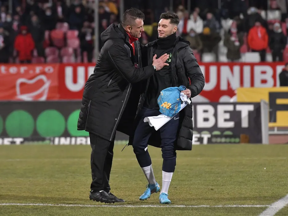 Emilian Dolha il saluta pe Andrei Burlacu inaintea meciului de fotbal dintre Dinamo Bucuresti si FCSB contand pentru Liga 1 Casa Pariurilor, desfasurat pe Stadionul Dinamo din Bucuresti, duminica 30 ianuarie 2022. © FOTO:Razvan Pasarica/SPORT PICTURES