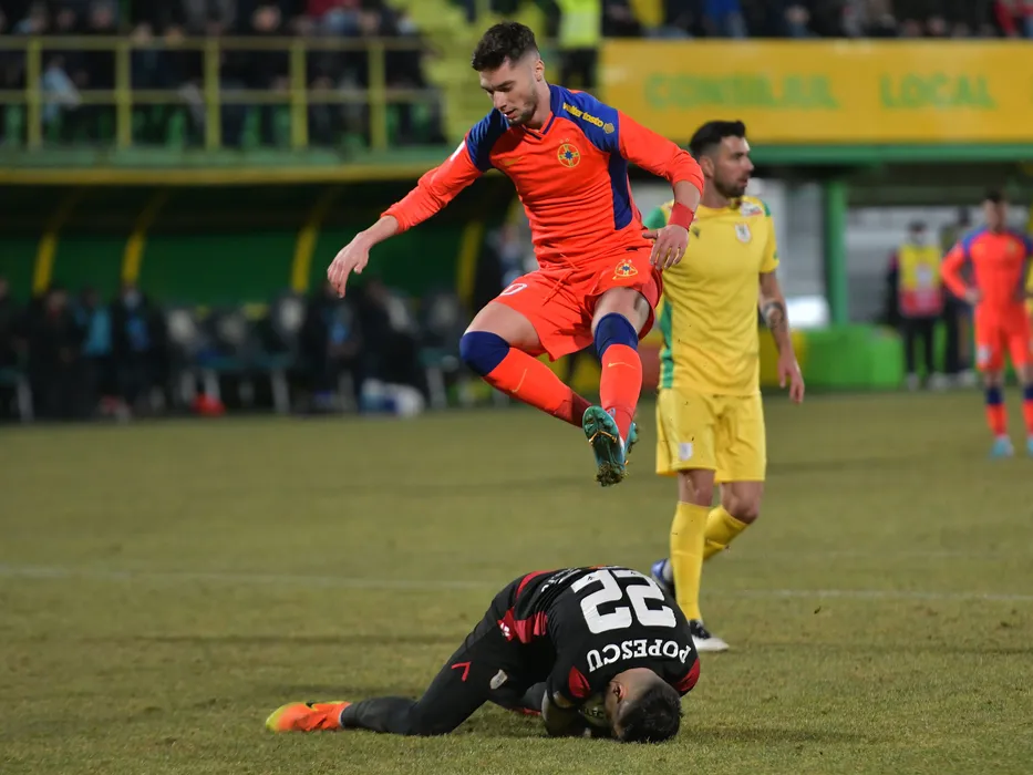 Andrei Burlacu si Alin Iustin Popescu in meciul de fotbal dintre CS Mioveni si FCSB, contand pentru Liga 1 Casa Pariurilor, desfasurat pe Stadionul Orasenesc din Mioveni, sambata 19 februarie 2022. © FOTO:Razvan Pasarica/SPORT PICTURES