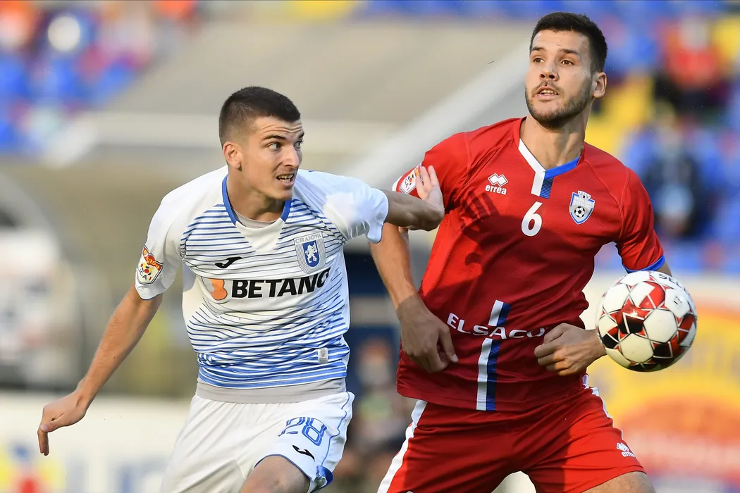 Mihai Valentin Mihaila si Andrei Chindris in meciul de fotbal dintre FC Botosani si Universitatea Craiova, contand pentru play-off-ul Ligii 1 Casa Pariurilor, disputat fara spectatori pe Stadionul Municipal din Botosani, duminica 19 iulie 2020. © FOTO:Razvan Pasarica/SPORT PICTURES