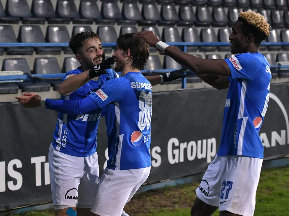 Virgil Andrei Ciobanu se bucura dupa un gol marcat alaturi de Alexi Paul Pitu si Ely Ernesto Lopes Fernandes in meciul de fotbal dintre Farul Constanta si Rapid Bucuresti, contand pentru Liga 1 Casa Pariurilor, desfasurat pe Stadionul central al Academiei Gheorghe Hagi din Ovidiu, sambata 4 decembrie 2021. © FOTO:Razvan Pasarica/SPORT PICTURES