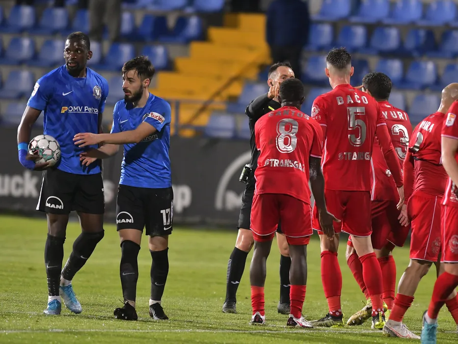 Juvhel Fred Tsoumou Hama si Virgil Andrei Ciobanu discuta cine sa bata penalty-ul obtinut de echipa lor in meciul de fotbal dintre FC Viitorul Constanta si Gaz Metan Medias, din cadrul Play-out-ul Ligii 1 Casa Pariurilor, desfasurat fara spectatori pe Stadionul Central al Academiei Gheorghe Hagi din Ovidiu, marti 20 aprilie 2021. © FOTO:Razvan Pasarica/SPORT PICTURES