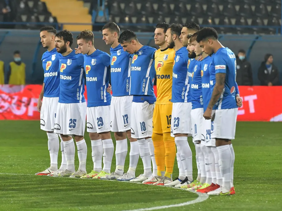 Fotbalistii constanteni tin un minut de reculegere la startul meciului de fotbal dintre Farul Constanta si FCSB, contand pentru Liga 1 Casa Pariurilor, desfasurat pe Stadionul central al Academiei Gheorghe Hagi din Ovidiu, joi 4 noiembrie 2021. © FOTO:Razvan Pasarica/SPORT PICTURES