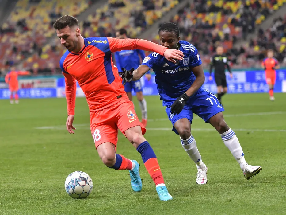 Andrei Ioan Cordea si Samuel Asamoah in meciul de fotbal dintre FCSB si FC U Craiova, contand pentru Liga 1 Casa Pariurilor, desfasurat pe Arena Nationala din Bucuresti, duminica 6 februarie 2022. © FOTO:Razvan Pasarica/SPORT PICTURES