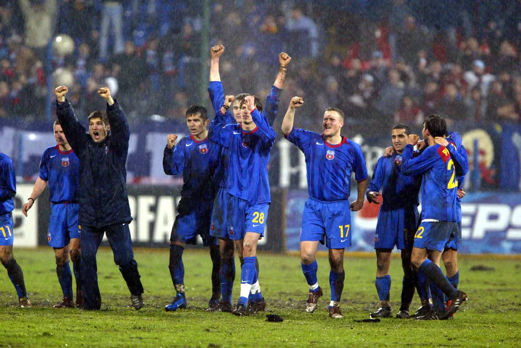 Steaua's players celebrate after they scored the last penalty at the end the second match vs Valencia in the UEFA Cup third round matches, in Bucharest, 24 February 2005. Steaua Bucharest won 4-3 on penalties to advance to the next round.