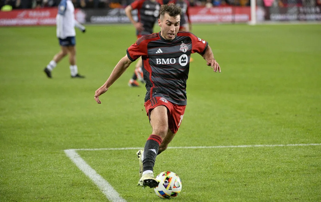 Apr 24, 2024; Toronto, Ontario, CAN; Toronto FC midfielder Andrei Dumitru (79) controls the ball against Simcoe County Rovers in the second half at BMO Field.,Image: 867722052, License: Rights-managed, Restrictions: *** World Rights ***, Model Release: no