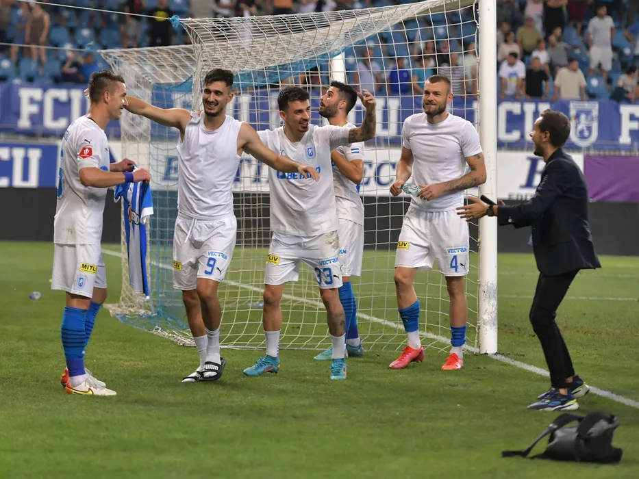 Fotbalistii craioveni Alexandru Mateiu, Andrei Virgil Ivan, Sergiu Catalin Hanca, Ante Roguljic si Alexandru Cretu se bucura dupa meciul de fotbal dintre FC U Craiova si Universitatea Craiova, contand pentru Superliga Superbet, desfasurat pe Stadionul Ion Oblemenco din Craiova, duminica 7 august 2022. © FOTO:Razvan Pasarica/SPORT PICTURES