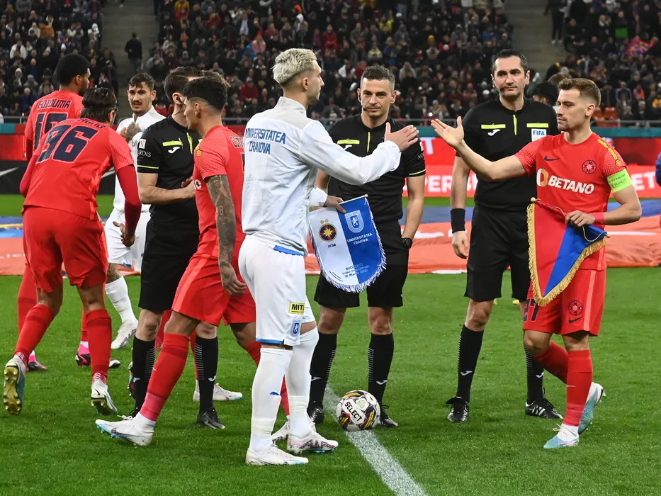 Brigada de arbitri formata din Sebastian Eugen Gheorghe, Florin Andrei si Mihai Marius Marica alaturi de capitanii Andrei Virgil Ivan si Darius Dumitru Olaru in meciul de fotbal dintre FCSB si Universitatea Craiova, contand pentru Play-off-ul Superligii Superbet, desfasurat pe Arena Nationala din Bucuresti, sambata 18 martie 2023. © FOTO:Razvan Pasarica/SPORT PICTURES