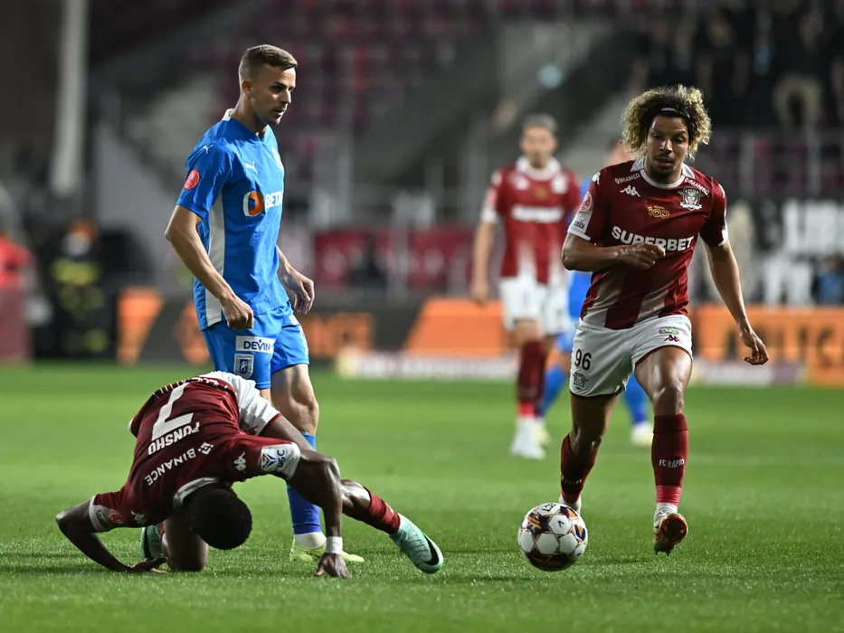 Nicușor Silviu Bancu, Funsho Ibrahim Bamgboye si Jayson Jordan Julien Romain Papeau in meciul de fotbal dintre Rapid Bucuresti si Universitatea Craiova, din cadrul Play off-ului Superligii Superbet, desfasurat pe Superbet Arena-Giulesti din Bucuresti, luni 29 aprilie 2024. © FOTO:Razvan Pasarica/SPORT PICTURES