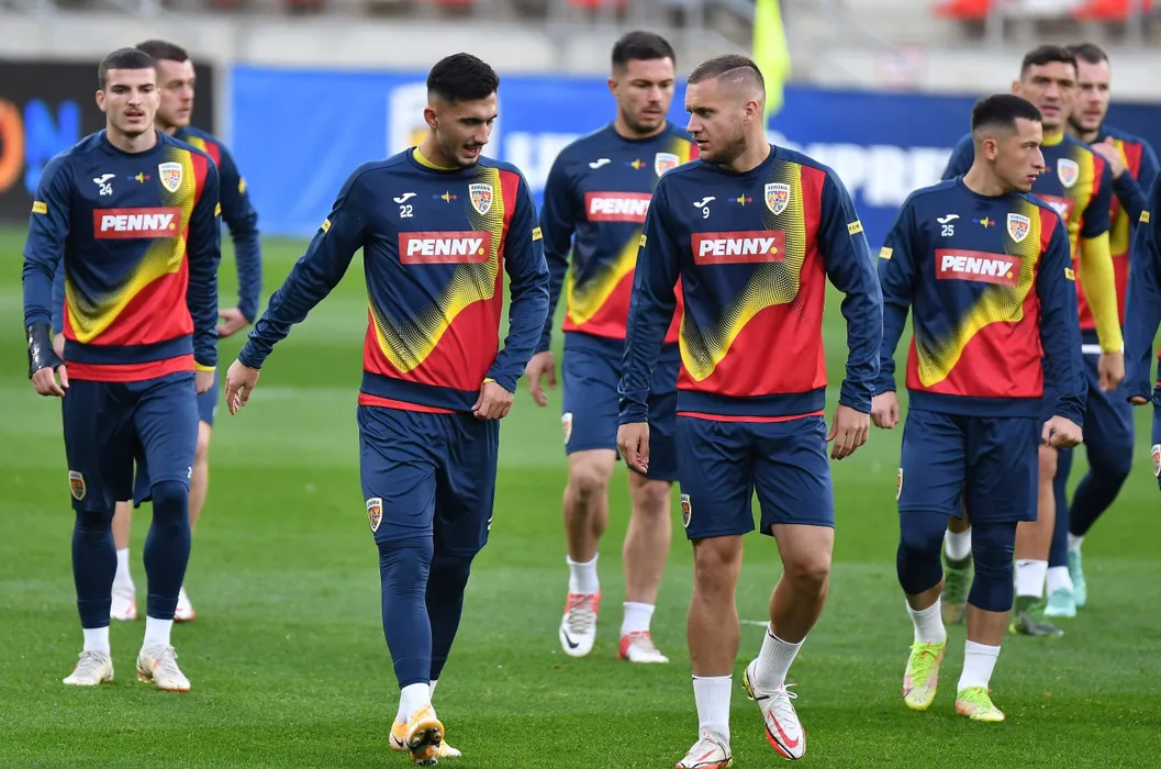 Fotbalistii romani Valentin Mihaila, Andrei Ivan, George Puscas si Olimpiu Morutan la antrenamentul oficial de dinaintea meciului impotriva Armeniei, din cadrul Preliminariilor Campionatului Mondial 2022, desfasurat pe Stadionul Steaua din Bucuresti, duminica 10 octombrie 2021. © FOTO:George Ilinca/SPORT PICTURES